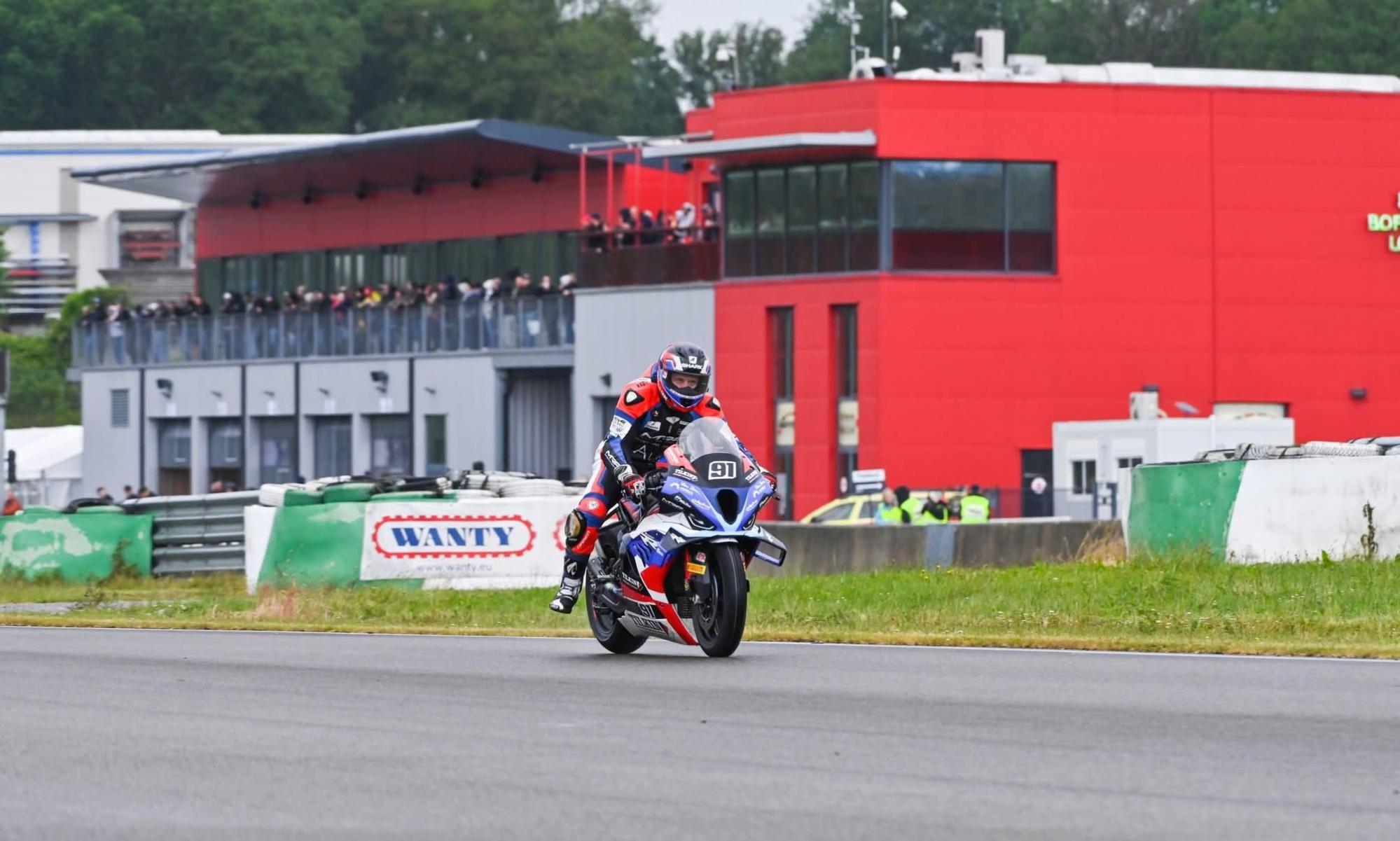 Na wederom een hele avond sleutel stond de geleende BMW klaar. Hoopte ik toch. Zware regenval, dus geen bandenpoker. Maar in de verkenningsronde ging het al bijna mis, de achterrem liep aan en het wiel blokkeerde. Ik had de rem iets te veel bijgesteld blijkbaar. Ik kon nog maar net tot in de pitlane geraken waar het euvel snel opgelost werd. Ik vatte de opwarmronde aan vanuit de pitstraat waardoor ik als allerlaatste van start moest gaan. Rood licht uit en boem. Geen raketstart maar ik had het minste bang op een nat Mettet. De 1ste linker bocht uitkomen rond de 10de plaats van de meer als 20 startende. Getrek en geduw wanneer ik passeerde. Eén voor één stak ik concurrenten voorbij tot ik op de 2de positie belande en mijn eigen ritme kon gaan rijden. Ik had een super gevoel met de motor en kon de 5 seconden voorsprong van Drieghe dicht rijden waarna er een klein gevecht ontstond. Uiteindelijk moest hij me laten gaan en reed ronde na ronde strakke tijden. Uiteindelijk won ik de wedstrijd die lang duurde met 5 seconden voorsprong. WAUW. Wat een gevoel, ik was er emotioneel van. Bedankt aan mijn trouwe pitcrew, Jo en sponsors voor de hulp!